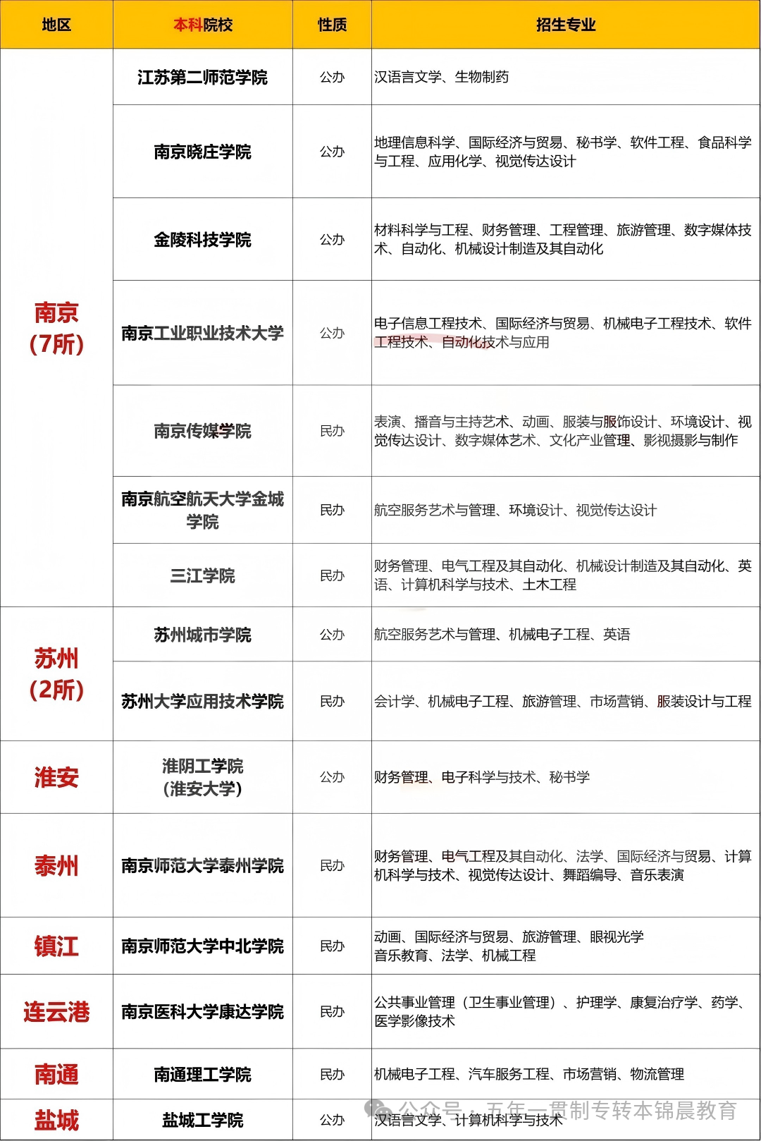 5、只针对全江苏省内城市招生(南京、苏州、无锡、常州、镇江、南通、扬州、盐城、泰州、淮安、徐州、宿迁、连云港),专转本是江苏特有的统招专升本的称呼。